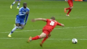 Namun, nasib berkata lain. Dalam pertandingan krusial melawan Chelsea, skor masih 0-0 saat Gerrard, yang menjadi ikon loyalitas dan kepemimpinan, melakukan kesalahan fatal. Ketika berusaha mengoper bola, Gerrard terpeleset secara tiba-tiba. Kesempatan ini langsung dimanfaatkan oleh Demba Ba untuk mencetak gol dan membawa Chelsea unggul.